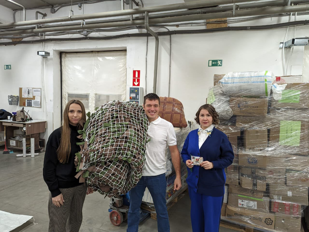 На этот раз, при поддержке Свердловского регионального отделения Союза женщин России, председатель и заместитель председателя ОО «Алапаевский городской союз женщин» Эльвира Грачёва и Ирина Штукина передали защитникам маскировочную сеть, которую сплели ученики школы №2 г.Алапаевска, а так же подарки к празднику.